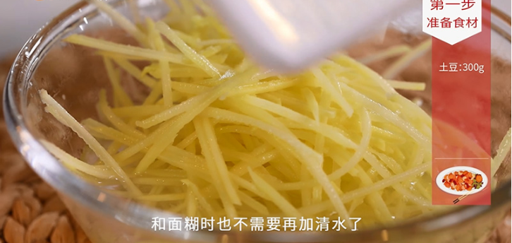 1、 土豆去皮,直接擦成丝到水里。(这样可防止土豆变色,和面糊时也不需要再加清水了)