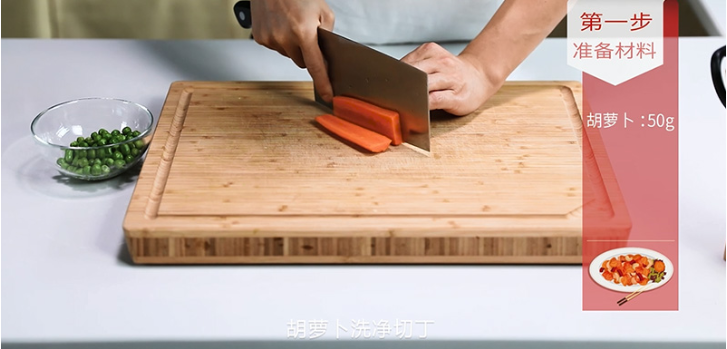 1.胡萝卜洗净切丁,青豌豆、玉米粒洗净待用。