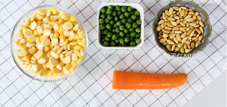 松子玉米食材:玉米300克 松子仁80克 胡萝卜50克 青豌豆50克