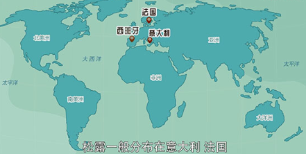 松露一般分布在意大利、法国、西班牙、中国、新西兰等国。它的食用气味特殊,含有丰富的蛋白质、氨基酸等营养物质。松露对生长环境的要求极其苛刻,且无法人工培育,产量稀少,导致了它的珍稀昂贵。因此欧洲人将松露与鱼子酱、鹅肝并列“世界三大珍肴”。