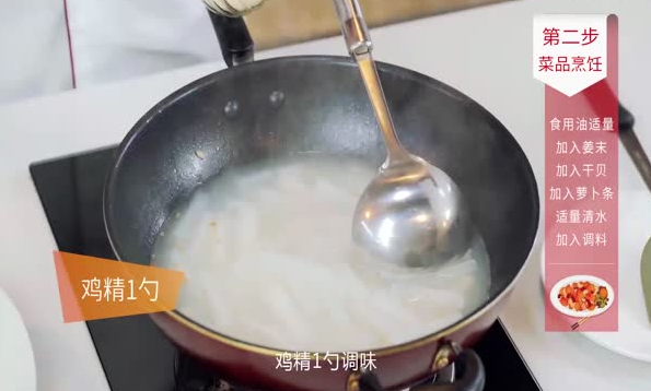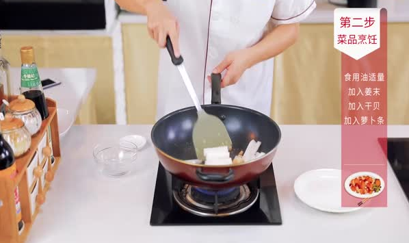 2.锅中加入适量油,油温烧至七成热,倒入干贝、姜末、萝卜条小火煸炒,倒入适量清水大火烧开;