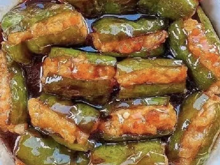 青椒要选形状规整、肉质厚的,薄皮的青椒煎后容易塌,填料也容易掉出。