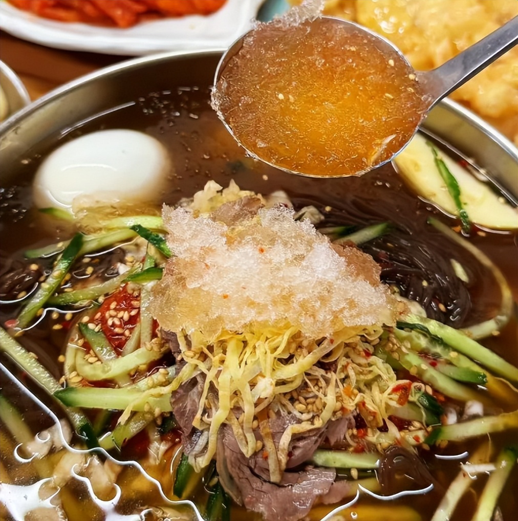 延吉冷面是朝鲜族传统面食的代表。荞麦面或小麦面煮熟后,浇上冰凉的牛肉清汤,配上辣白菜、苹果片、半个煮鸡蛋,有的还会加一点冰块。夏天来这么一碗,酸甜冰凉、辣中带爽,吃完全身都通透。很多第一次吃的人会被那股酸甜劝退,但一旦爱上,就根本停不下来。