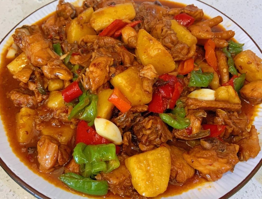 鸡肉切块焯水,土豆切块备用,锅里炒香葱姜蒜和豆瓣酱,放入鸡肉翻炒上色,加清水没过食材,放入土豆,炖到软烂入味,最后加点青椒即可。