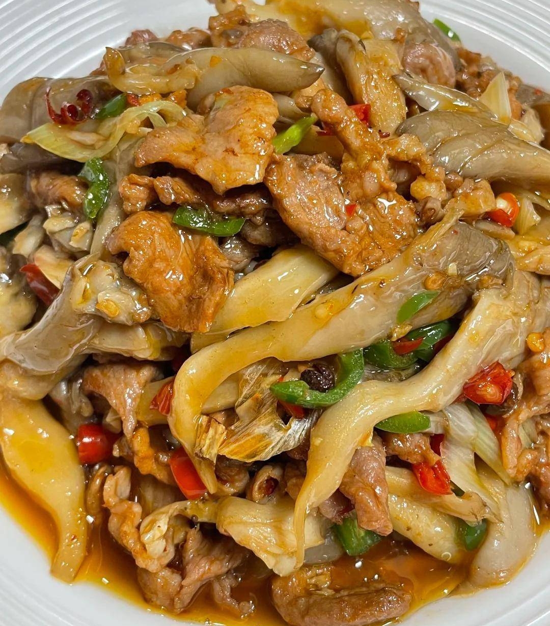 猪肉切片用生抽腌一下,先下锅炒到变色盛出,再把蘑菇炒软出水,把肉片倒回去,加盐和少许蚝油调味,翻炒均匀就可以吃。
