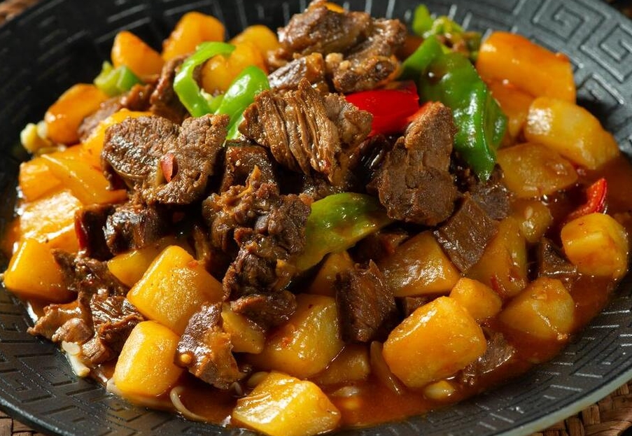 牛肉切块焯水,锅里炒香调料后放入牛肉翻炒,加开水慢炖到软烂,再加入土豆块一起炖,直到土豆绵密,加盐调味,汤汁浓郁很下饭。