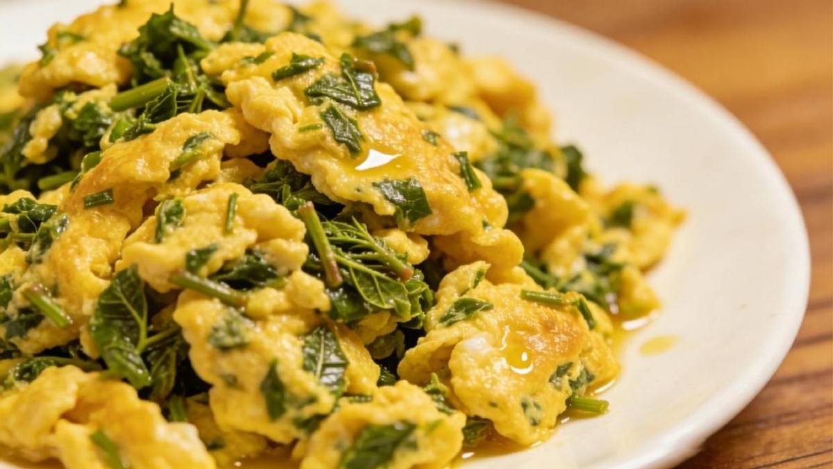 这道香椿炒蛋,金黄裹着翠绿,香气扑鼻,鸡蛋软嫩,香椿鲜香,一口下去,全是春天独有的味道。