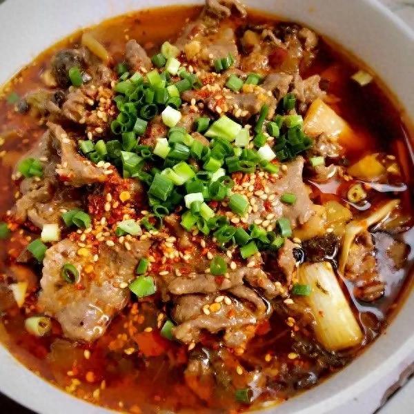 牛肉滑嫩得很,带点淡淡血色,入口先是辣,再是花椒的麻,最后才是牛肉本身的鲜。