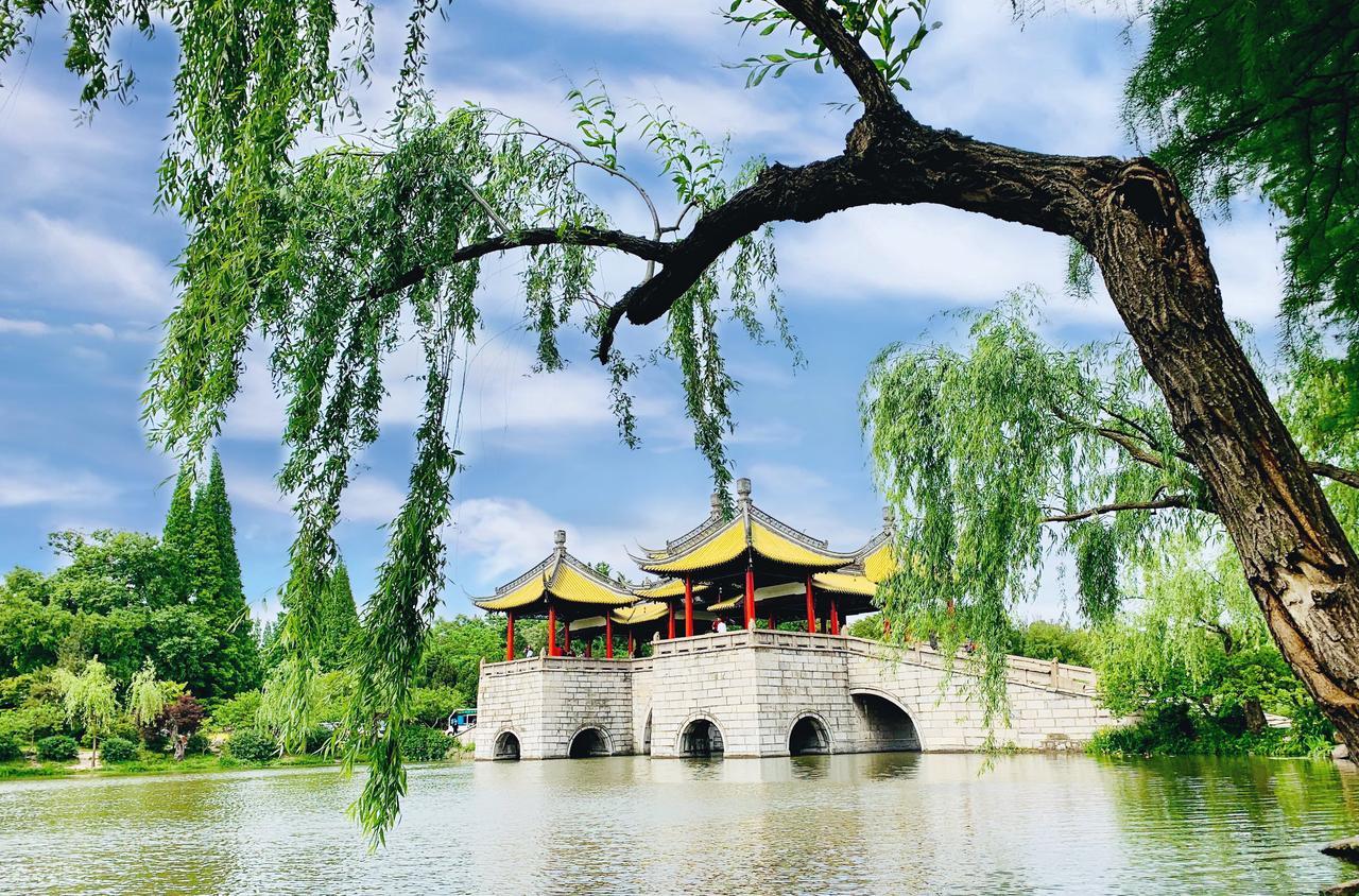 清明时节的扬州,瘦西湖的垂柳是嫩绿色的新叶,湖面平静,二十四桥在水边,五亭桥的倒影清晰,这个季节的扬州是一年里颜色最好的时候。
