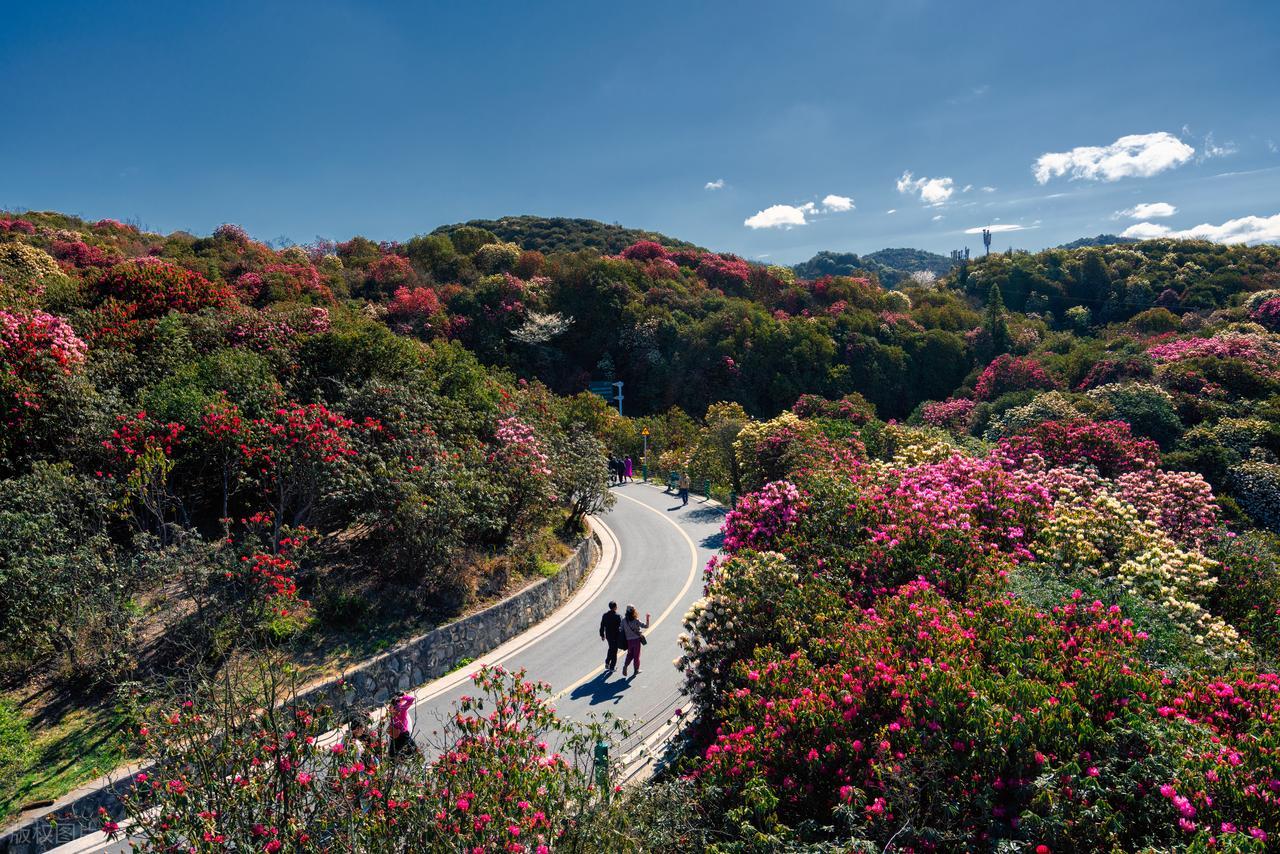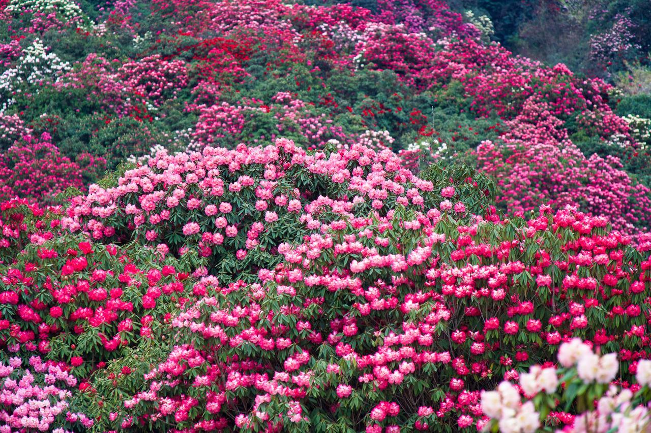 百里杜鹃是国内面积最大的天然杜鹃林,绵延近百公里,花色有绛红、深粉、浅粉、白色、紫色多种,在不同海拔和坡向交替开放,3月下旬到4月上旬是盛花期,清明正好是高峰。
