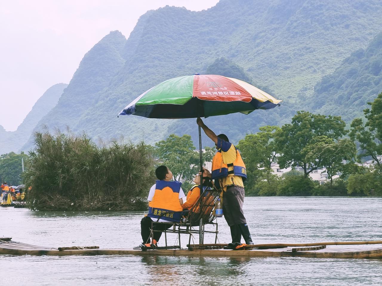 遇龙河漂流是阳朔的核心体验。不是那种激流漂,是竹筏顺流慢慢走,导游撑竿,两岸是喀斯特山峰,桃花还没全谢,水面是浅绿色的。全程两小时,有一点晒,清明天气刚刚好,不会太热。