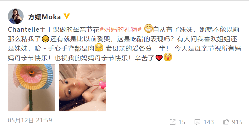 方媛还表示,自从有了妹妹之后,大女儿并不像以前那样喜欢黏她了,不过她却有了一个坏毛病,就是比以前更加爱哭了,难道这是大女儿吃醋的表现吗?自从有了第二胎之后,很多人都会问方媛一个问题:是喜欢姐姐多一点还是妹妹多一点呢?方媛的回答则是:作为老母亲,她会把她的爱分成一两半,每个人得到的母爱都是一样的,毕竟对于她来说手心手背都是肉,不可能存在偏爱哪一方的局面出现是不是?在文字的最后,方媛也祝自己的妈妈母亲节快乐,也许是当了妈妈之后,她更能体会到当母亲的那一份辛苦,所以她也表达了自己对于妈妈的爱。