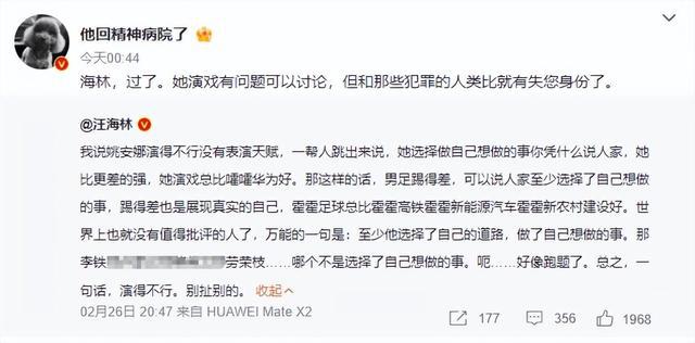 2 月 26 日晚间,编剧汪海林在自己社交媒体上提到姚安娜演技,称其演得不行没有天赋,并对网友的观点 " 姚安娜选择做自己想做的事你凭什么说人家,她比更差的强,她演戏总比嚯嚯华为好 " 进行回怼。