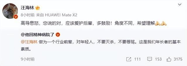 随后,《猎冰》导演高群书转发汪海林动态并进行回复,称 " 海林,过了。她演戏有问题可以讨论,但和那些犯罪的人类比就有失您身份了 ",并喊话汪海林 " 做为一个行业前辈,对年轻人,不要灭杀,不要辱骂。这是我们年长者的基本素质 "。