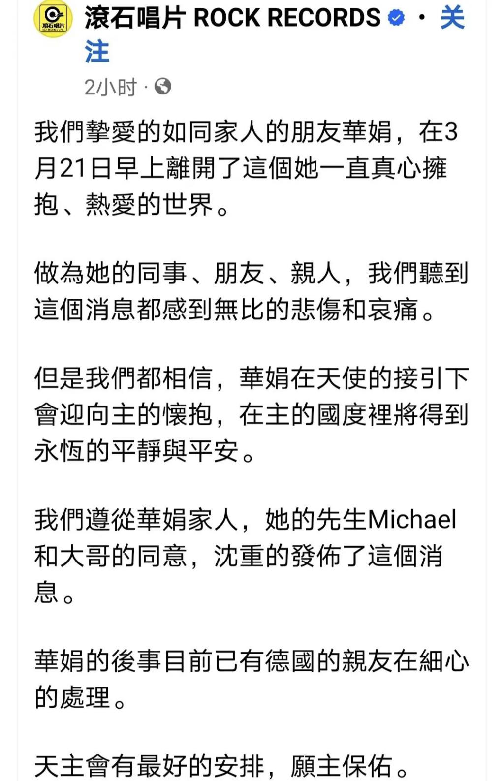 3 月 24 日,滚石唱片发出一条令人伤感的消息,华语流行乐史上最杰出的创作人之一,女版李宗盛,用音乐在 70 后、80 后两代人的青春岁月留下印记的郑华娟,已经在 21 日离开了这个世界。