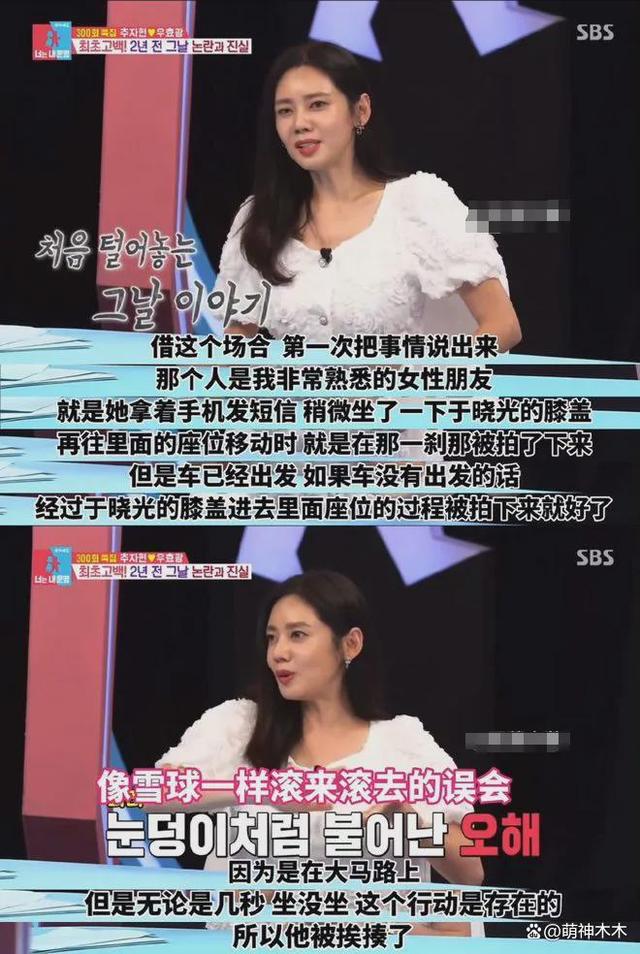 直到 23 年 7 月份,秋瓷炫首次在节目中正面回应了于晓光的出轨事件。澄清出轨事件中的女性已婚,并且是夫妻两人共同的好友,媒体拍到的她坐在于晓光腿上的画面也只是因为她在发消息,稍微坐了一下于晓光的膝盖,很快就移开进到车里了。
