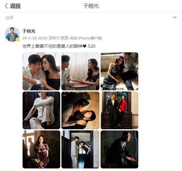 5 月 18 日晚," 中韩明星夫妇 " 秋瓷炫和于晓光也同时在个人的社交平台上分享了一组九宫格美照,这也是他们登上了某时尚杂志封面的照片,也都为此配文:" 世界上最藏不住的是爱人的眼神❤️",这也受到了网友们的广泛关注。