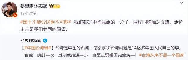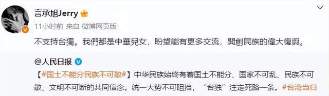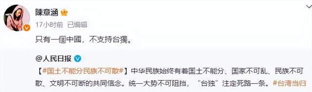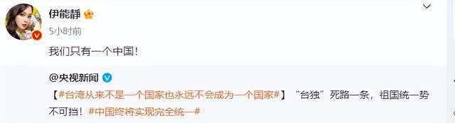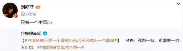 而刘畊宏宁愿置顶 " 一个中国 " 的转发微博,都不愿意转发表明 " 台湾回归祖国 " 的立场,也是一言难尽。他的好兄弟周杰伦更是自始至终沉默让人无语。同类型表态 " 一个中国 " 的还有刘亦菲、伊能静、陈意涵等,也都引发争议。