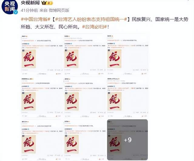 统计央视点名名单,一共发布了 18 位台湾艺人的微博截图,分别是侯佩岑、张韶涵、杨丞琳、欧阳娜娜、苏有朋、张信哲、文淇、吴克群、明道、赖冠霖、陈乔恩、汪东城、周传雄、陈妍希、黄曦彦、杨宗纬、吴奇隆、辰亦儒。他们文案都非常统一,带了 " 中国终将实现完全统一 " 的热搜词条,还坚定表明 " 台湾必将回归祖国的怀抱 "。
