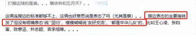 看了这么久,发现他们几乎都犯的一个错误,认为只要模糊表达认同 " 一个中国 " 与 " 中华民族 " 就可以避险过关。事实上并不是,此时不仅需要 " 一个中国 " 的态度,也要支持 " 台湾回归祖国 "。最后再次强调,关键时刻这些艺人如果态度还模糊,那也不怪网友质疑和抵制了。