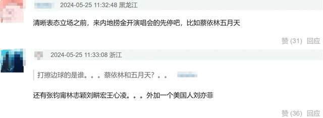 而像蔡依林和五月天则是直接连转发都不愿意,在演唱会上暧昧表达立场的行为也不被网友接受。蔡依林在演唱会上对观众喊 " 我们中国南昌最热情了 ",五月天在演唱会上说 " 我们中国人到北京一定要吃烤鸭的 ",台下的粉丝都一片欢呼声,还营销到热搜上,也成为了粉丝为偶像澄清立场的证据。