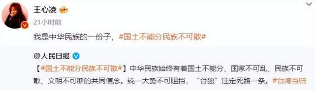 这类型的表述在当下是不合时宜的," 台湾回归祖国统一 " 是精准表达,而不是广义的中华民族交流。当下的关键词也是 " 中国台湾省 ",显然,王心凌等艺人没有精准 get 到正确表达。而 " 王心凌我是中华民族的一份子 " 热搜也是大翻车,被网友吐槽模棱两可不想得罪人,结果是两边都没讨好。