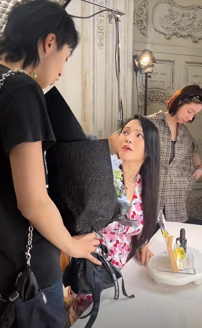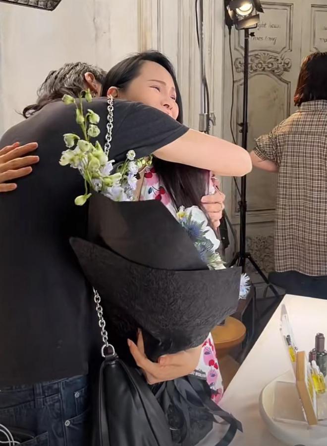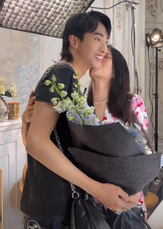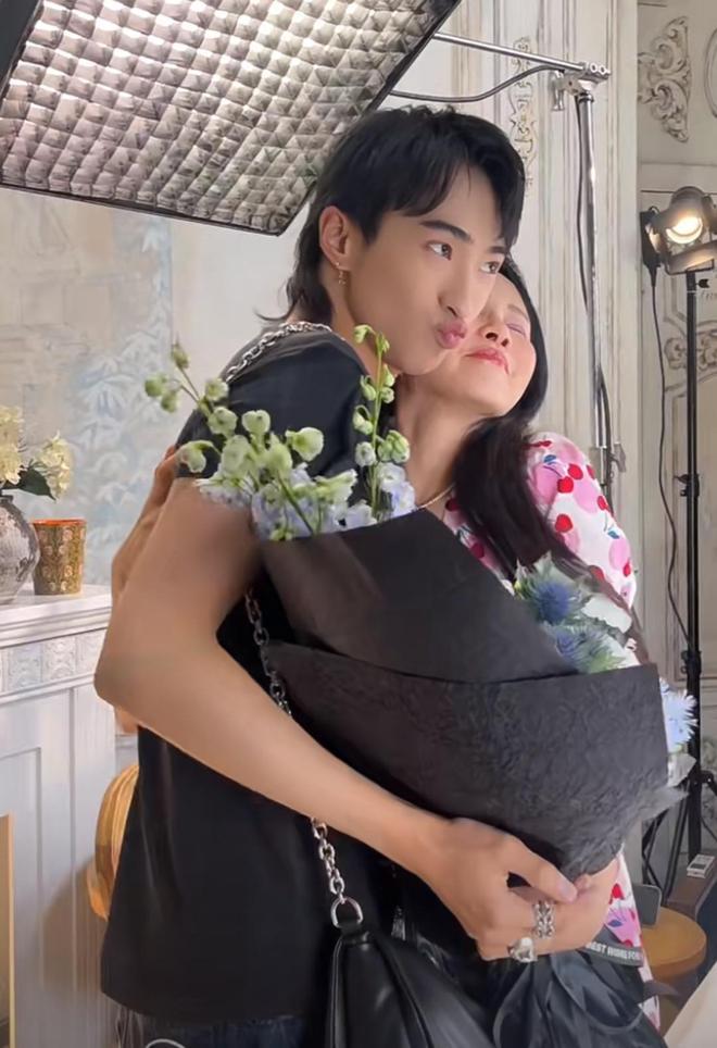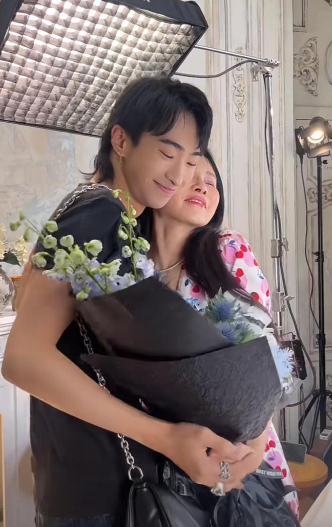 彩排期间,儿子恩利突然现身直播间,手里拿着一束鲜花来探班妈妈,还故意用花挡住了自己的脸。