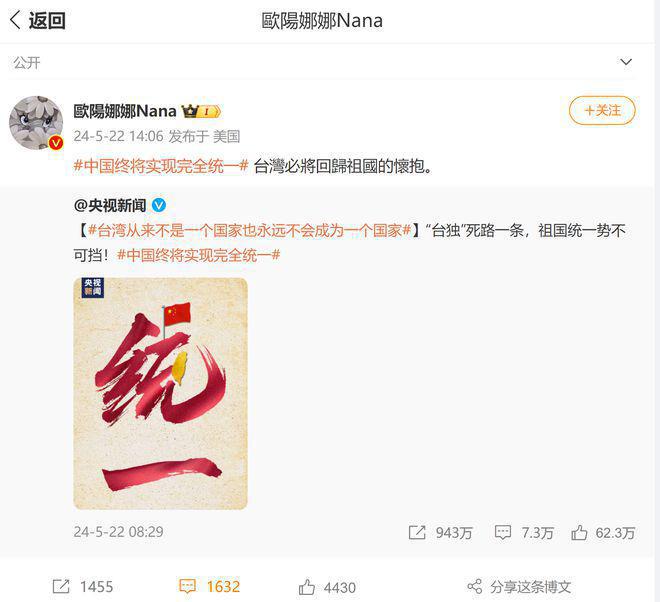 中午 14 点 06 分,台湾艺人欧阳娜娜率先在美国转发了央视这张图片,用繁体字打出了 " 台湾必将回到祖国的怀抱!" 在这些大是大非上,欧阳娜娜确实做得很棒,很坚定。她从来都是 " 一个中国 " 的坚定拥护者!