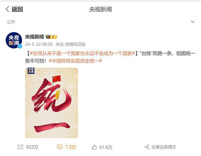 5 月 22 日早上,中央电视台在官方社交账号上发布了这样一张图片:祖国终将统一,台湾终将回到祖国怀抱。