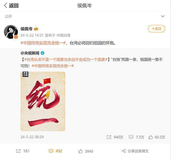 侯佩岑还专门用简体字打出了 " 台湾必将回归祖国怀抱 "。