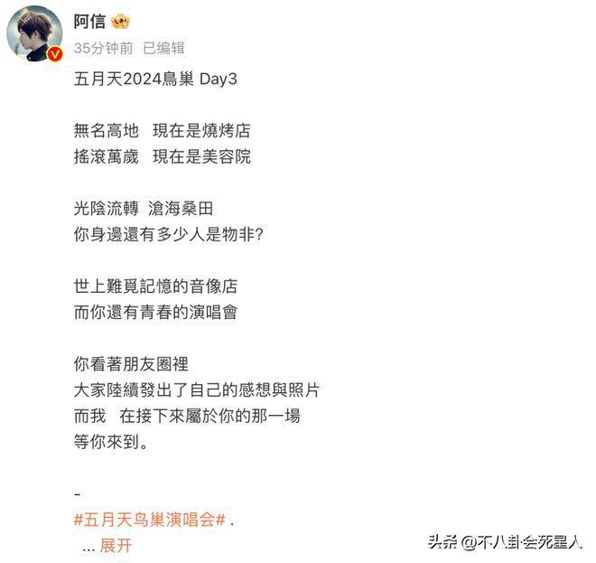 五月天也是网友的重点关注对象,此前,阿信疑似在演唱会上假唱的事件不了了之。可如今,在如今关键的发声时间点,阿信宁愿发长文宣传演唱会,也没有对动态进行转发。