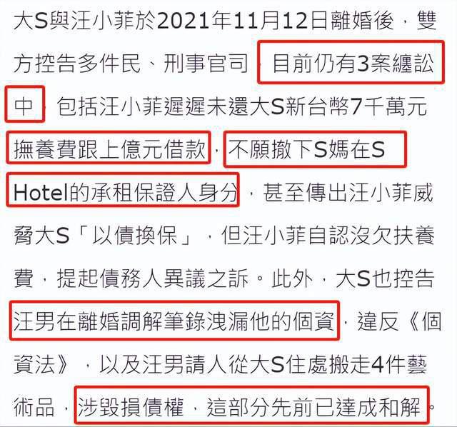 两人的官司台媒也做了一个整理,称现在还剩 3 个主要案子没有完结。首先就是抚养费和汪小菲欠大 S 钱一事,再就是 S 妈现在还是酒店承租担保人身份,还有就是汪小菲涉嫌泄露大 S 的个人资料问题,双方应该会针对这些问题再度商讨和解。