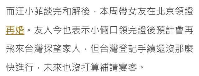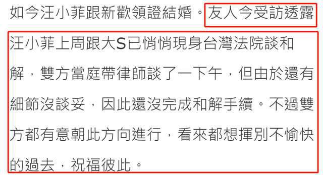 但还不止这一件喜事,据台媒报道,汪小菲和大 S 的离婚风波终于要走到大结局了。汪小菲再婚,台媒采访到了知情人,知情表示汪小菲和大 S 早在汪小菲结婚前一周,就已经悄悄现身法庭谈和解了双方都带着律师,谈了一下午。