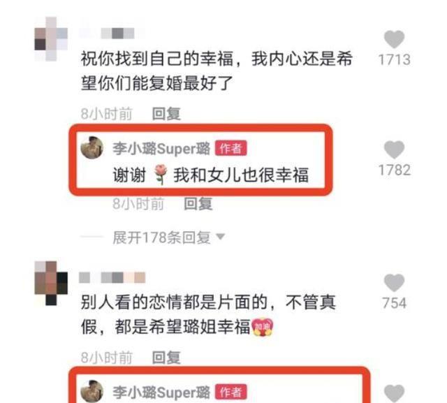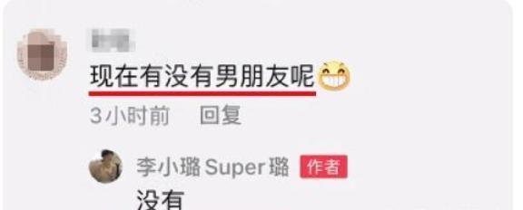 恢复单身后李小璐的感情状态一直备受关注,不少支持她的粉丝甚至希望为了小甜馨能和贾乃亮复合。甚至还跑到她的社交平台询问她的感情状况,被问有没有男友时,李小璐亲自下场回应:“没有”,被催希望和贾乃亮复合的时候,李小璐也只是回应“以和女儿一起很幸福”。