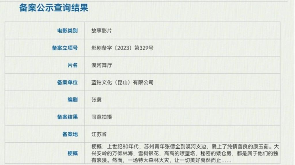 电影《漠河舞厅》备案地为江苏省,备案单位为蓝钻文化(昆山)有限公司,相关备案信息还首度公开了编剧——张冀(代表作:《亲爱的》《中国合伙人》《夺冠》)以及剧情梗概:上世纪 80 年代,苏州青年张德全到漠河支边,爱上了纯情善良的康玉茹,然而,一场特大森林火灾,让一切美好戛然而止 ……