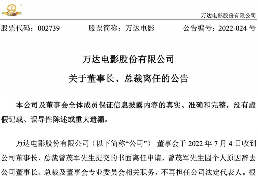 7 月 4 日晚间,万达电影发布公告,董事会于 2022 年 7 月 4 日收到公司董事长、总裁曾茂军先生提交的书面离任申请,曾茂军先生因个人原因辞去公司董事长、总裁及董事会专业委员会相关职务,不再担任公司法定代表人。