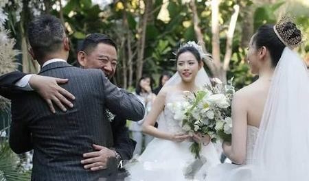 两个姑娘穿着洁白的婚纱,互相亲吻,非常浪漫。两个父亲互相拥抱,满脸幸福。
