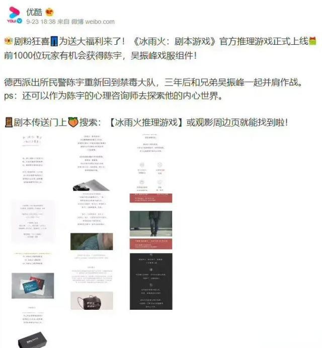 9 月 23 日,优酷官方微博发文称给剧粉送大福利,宣布《冰雨火:剧本游戏》 官方推理游戏正式上线,前 1000 位玩家有机会获得陈宇(王一博饰演)、吴振峰(陈晓饰演)戏服组件。