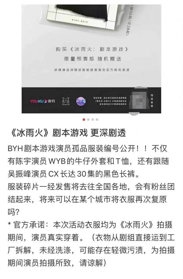 网上曝光的《冰雨火》剧本游戏官方承诺特意强调:衣物直接从剧组运到工厂拆解,未经洗涤。