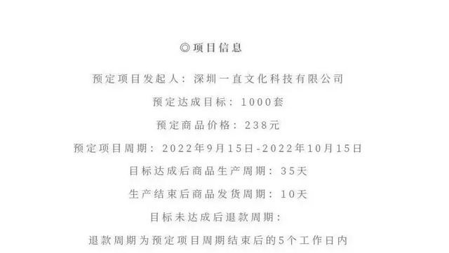 该项目信息显示预定达成目标 1000 套,预定商品价格 238 元。按照这个预定信息,项目方能收到 238000 元。