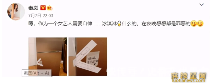 秦岚已经41岁了,但她特别注重身材管理和皮肤护理。9号晚上,秦岚在社交平台分享了一张照片,照片中她家里的电冰箱被贴上了两条白色的封条,封条上写着“姐姐不可以哦”的可爱文字,秦岚还配文称身为一个女艺人,是需要严格的自律,冰淇淋之类的在晚上想想都是十分罪恶的。