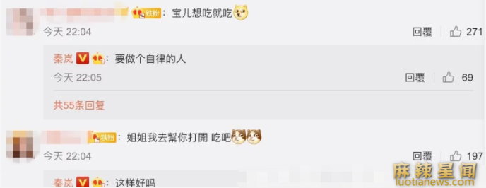 动态下网友们和秦岚的对话也很好玩,有网友对秦岚说想吃就吃,秦岚回应要做一个自律的人。还有人说我来帮你吃,秦岚回复你这样就过分了。没有一点明星的架子,仿佛就是朋友间的对话,这种感觉让人舒服。