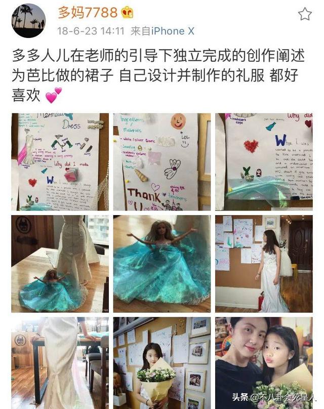 除此之外,黄多多还会设计衣服,其身上穿的这条小裙子,就是她用环保材料自己做的,同时还设计了一条给芭比穿的裙子: