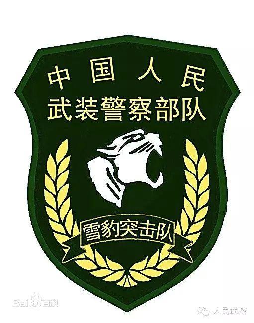 隶属于武警部队,臂章中间绣着张嘴怒吼雪豹的侧面头像,豹头两边为橄榄枝,寓意要保卫社会和平。