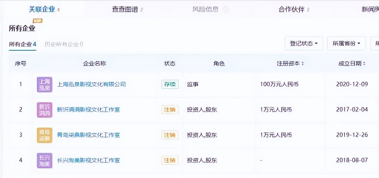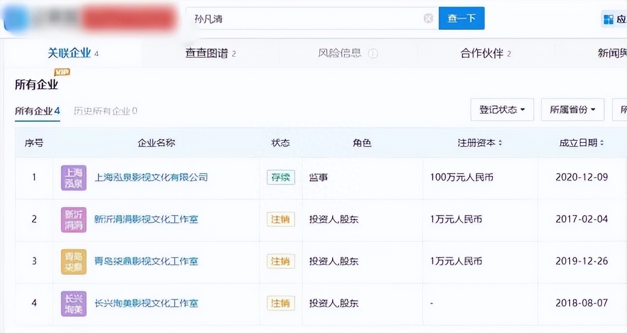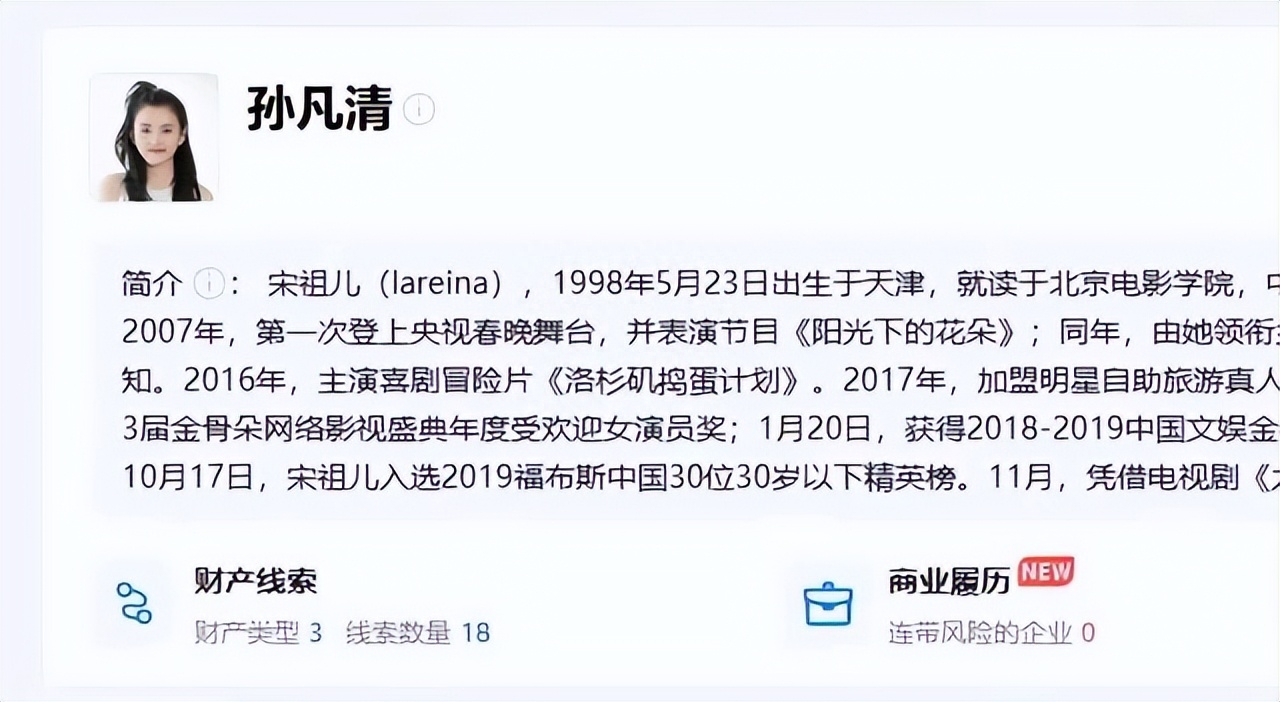 深挖之下,宋祖儿原名孙凡清,关联的4家公司,已经注销了三家,仅剩上海一家文化有限公司存续,由她担任监事职务。
