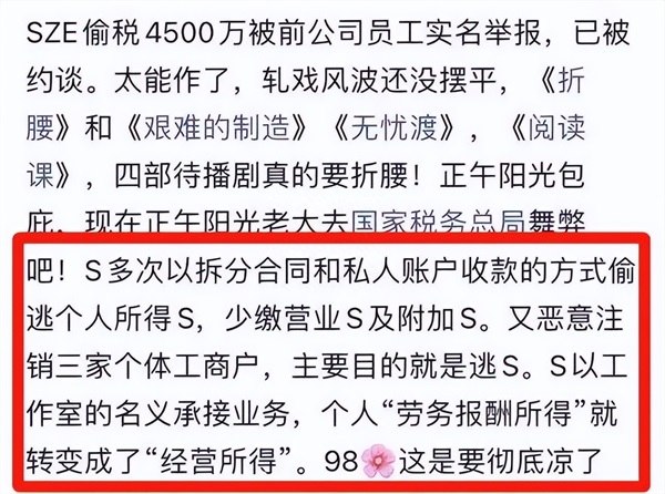 一旦税务局核查确定,宋祖儿确实存在偷税漏税,那么不止是她的前途堪忧,还有4部热度不低的剧组受到影响要推迟上映,其中包括正午阳光的《艰难的制造》、刘宇宁合作的《折腰》、任嘉伦合作的《无忧渡》以及跟侯明昊的《阅读课》。
