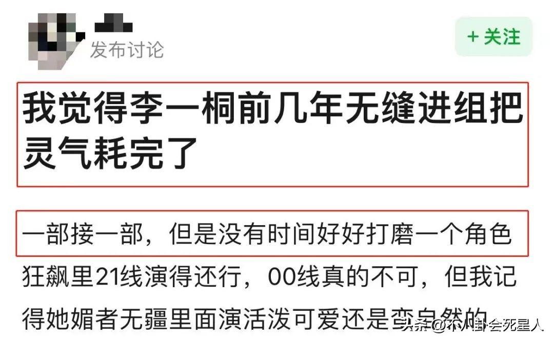 关于李一桐的轧戏行为,网友也表示她此前的无缝进组“耗完了灵气”,“一部接一部,但是没有时间好好打磨一个角色”。