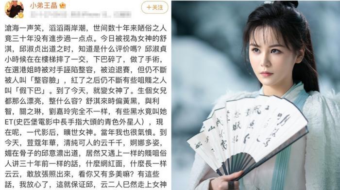 王晶写道:今日被视为女神的舒淇,邱淑贞出道之时,知道是什么评价吗?邱淑贞小时候在楼梯摔了一交(跤),下巴碎了,做了手术,在选港姐时被对手诬陷整容,被迫退赛,但仍不断被人叫整容脸,红了之后仍不断有些咀(嘴)贱之人叫假下巴。