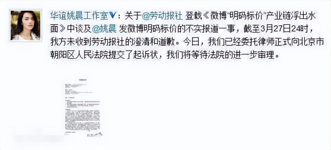 2013年,劳动报社刊登一篇名为《微博明码标价产业链浮出水面》的文章,直指“微博女王”姚晨发微博收费。