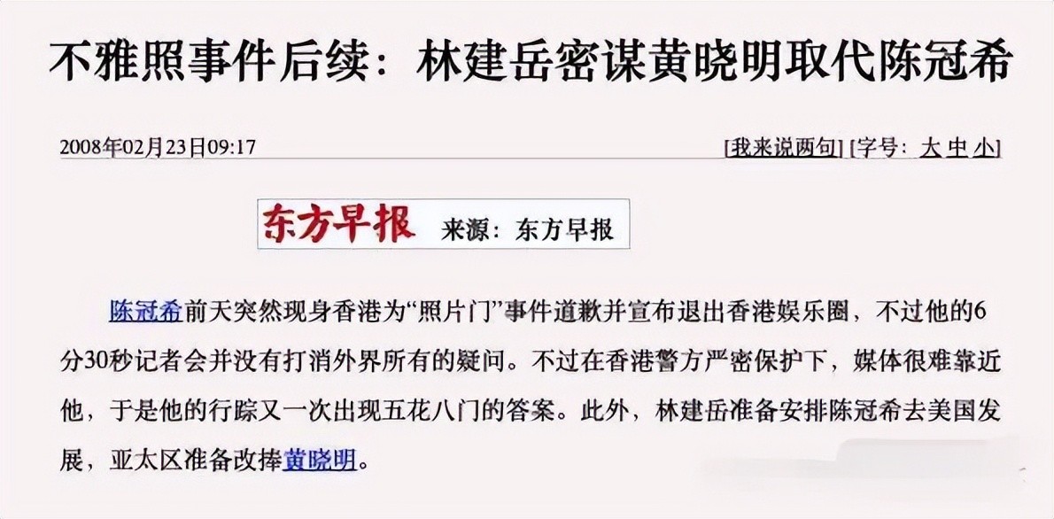 “林建岳密谋黄晓明取代陈冠希,安排陈冠希去美国发展,亚太区改捧黄晓明。”